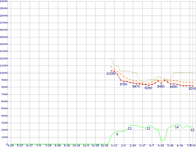 0S03191(純正パッケージ品) (2TB,64MB)の価格推移↑前グラフ↓次グラフ(2010年4月29日〜2011年7月14日)※このグラフは過去のデータも税率5%相当に調整した税込み相当額のグラフです。●関連グラフHDD/SSD主要製品の最安値推移HDD/SSD主要製品(最安値1万円未満)の最安値推移HDD 2TB〜2.5TB未満の最安値推移DESKSTAR (6Gb/s)の最安値推移●凡例最安値(点線部は販売店未確認または未調査)平均値最高値ショップ数