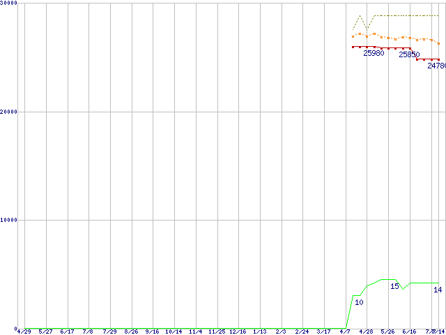 SSD 320 (160GB,MLC)の価格推移↑前グラフ↓次グラフ(2010年4月29日〜2011年7月14日)※このグラフは過去のデータも税率5%相当に調整した税込み相当額のグラフです。●関連グラフHDD/SSD主要製品の最安値推移HDD/SSD主要製品(最安値2万円以上)の最安値推移HDD 160〜200GB未満の最安値推移SSD 320 (SSD,3Gbps,2.5インチ,リード270〜200MB/s・ライト220〜45MB/s)の最安値推移●凡例最安値(点線部は販売店未確認または未調査)平均値最高値ショップ数