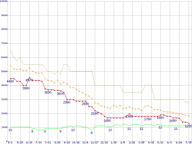PC3-10600 2GBの価格推移↑前グラフ↓次グラフ(2010年5月1日〜2011年7月15日)※このグラフは過去のデータも税率5%相当に調整した税込み相当額のグラフです。●関連グラフメモリ主要製品の最安値推移2GBモジュール/1GBモジュール×2枚の最安値推移メモリ主要製品(最安値5千円未満)の最安値推移PC3-10600(DDR3-1333) DDR3 SDRAM DIMMの最安値推移●凡例最安値(点線部は販売店未確認または未調査)平均値最高値ショップ数