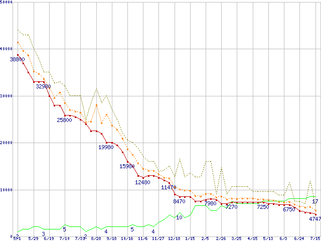 PC3-12800 4GB×2枚組みセットの価格推移↑前グラフ↓次グラフ(2010年5月1日〜2011年7月15日)※このグラフは過去のデータも税率5%相当に調整した税込み相当額のグラフです。●関連グラフメモリ主要製品の最安値推移メモリ主要製品(最安値5千円未満)の最安値推移PC3-12800(DDR3-1600) DDR3 SDRAM DIMMの最安値推移●凡例最安値(点線部は販売店未確認または未調査)平均値最高値ショップ数