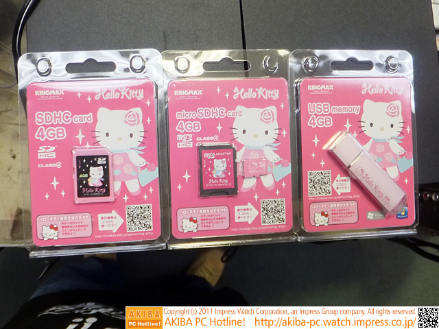 ![]() | AKIBA PC Hotline! 今週見つけた新製品:フラッシュメモリカード/USBメモリ [拡大画像]KINGMAX Hello Kitty SDHCcard 4GB(KIT-SDH_C4X4G) KINGMAX Hello Kitty microSDHCcard 4GB(KIT-MCSD4X4G) KINGMAX Hello Kitty USBmemory 4GB(KIT-4GBUD05) |