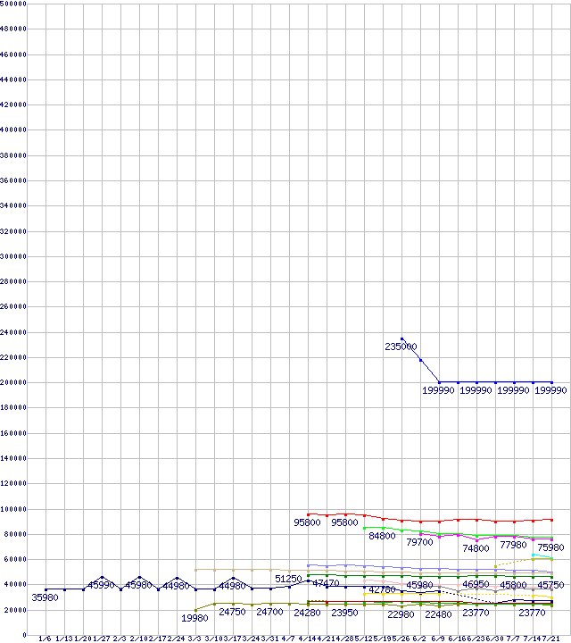HDD/SSD主要製品(最安値2万円以上)の最安値推移↑前グラフ(2011年1月6日〜2011年7月21日)※このグラフは過去のデータも税率5%相当に調整した税込み相当額のグラフです。凡例VTX3-25SAT3-480G (480GB,MLC)SSD 320 (600GB,MLC)CT512M4SSD2 (512GB,MLC)その他6Gbps対応SSD (512GB,MLC)VTX3MI-25SAT3-240G (240GB,MLC)その他2.5インチSSD (512GB,MLC)VTX3-25SAT3-240G (240GB,MLC)SSDSC2MH250A2K5 (250GB,MLC)SSD 320 (300GB,MLC)CT256M4SSD2 (256GB,MLC)その他6Gbps対応SSD (256GB,MLC)VTX3MI-25SAT3-120G (120GB,MLC)その他2.5インチSSD (256GB,MLC)SSD 320 (160GB,MLC)VTX3-25SAT3-120G (120GB,MLC)SSDSC2MH120A2K5 (120GB,MLC)※製品名をクリックすると個別のグラフを表示します※点線部は販売店が確認できなかった、または調査データがないことを示します