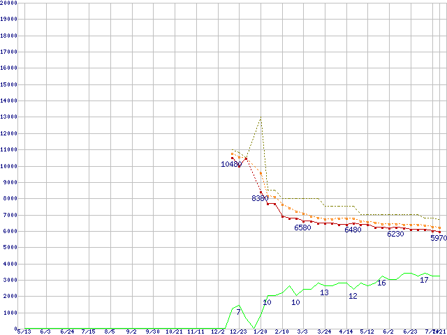 ST2000DL003 (2TB,64MB)の価格推移↑前グラフ(2010年5月13日〜2011年7月21日)※このグラフは過去のデータも税率5%相当に調整した税込み相当額のグラフです。●関連グラフHDD/SSD主要製品の最安値推移HDD/SSD主要製品(最安値1万円未満)の最安値推移HDD 2TB〜2.5TB未満の最安値推移Barracuda Green (5900rpm,6Gbps)の最安値推移●凡例最安値(点線部は販売店未確認または未調査)平均値最高値ショップ数