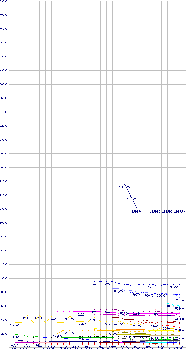 HDD/SSD主要製品の最安値推移↑前グラフ↓次グラフ(2011年1月13日〜2011年7月28日)※このグラフは過去のデータも税率5%相当に調整した税込み相当額のグラフです。凡例VTX3-25SAT3-480G (480GB,MLC)SSD 320 (600GB,MLC)その他6Gbps対応SSD (512GB,MLC)CT512M4SSD2 (512GB,MLC)VTX3MI-25SAT3-240G (240GB,MLC)その他2.5インチSSD (512GB,MLC)SSDSC2MH250A2K5 (250GB,MLC)SSD 320 (300GB,MLC)VTX3-25SAT3-240G (240GB,MLC)CT256M4SSD2 (256GB,MLC)その他6Gbps対応SSD (256GB,MLC)VTX3MI-25SAT3-120G (120GB,MLC)SSD 320 (160GB,MLC)SSDSC2MH120A2K5 (120GB,MLC)その他2.5インチSSD (256GB,MLC)VTX3-25SAT3-120G (120GB,MLC)SSD 320 (120GB,MLC)CT128M4SSD2 (128GB,MLC)その他6Gbps対応SSD (128GB,MLC)VTX3-25SAT3-60G (60GB,MLC)0S03088(純正パッケージ品) (3TB,64MB)0S03229(純正パッケージ品) (3TB,32MB)その他2.5インチSSD (128GB,MLC)WD30EZRX (3TB,64MB)CT064M4SSD2 (64GB,MLC)その他6Gbps対応SSD (64GB,MLC)0S03191(純正パッケージ品) (2TB,64MB)HN-M101MBB (1TB,8MB)WD25EZRS (2.5TB,64MB)WD10TPVT (1TB,8MB,12.5mm厚)0S03224(純正パッケージ品) (2TB,32MB)ST2000DL003 (2TB,64MB)WD20EARX (2TB,64MB)HD204UI (2TB,32MB)0S03085 (750GB,8MB)その他2.5インチSSD (64GB,MLC)WD7500BPVT (750GB,8MB)ST31000524AS (1TB,32MB)WD10EARX (1TB,64MB)※製品名をクリックすると個別のグラフを表示します※点線部は販売店が確認できなかった、または調査データがないことを示します