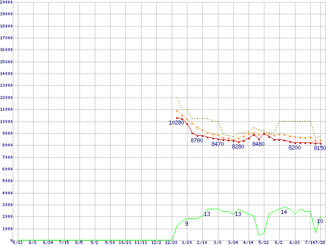 0S03191(純正パッケージ品) (2TB,64MB)の価格推移↑前グラフ↓次グラフ(2010年5月13日〜2011年7月28日)※このグラフは過去のデータも税率5%相当に調整した税込み相当額のグラフです。●関連グラフHDD/SSD主要製品の最安値推移HDD/SSD主要製品(最安値1万円未満)の最安値推移HDD 2TB〜2.5TB未満の最安値推移DESKSTAR (6Gb/s)の最安値推移●凡例最安値(点線部は販売店未確認または未調査)平均値最高値ショップ数