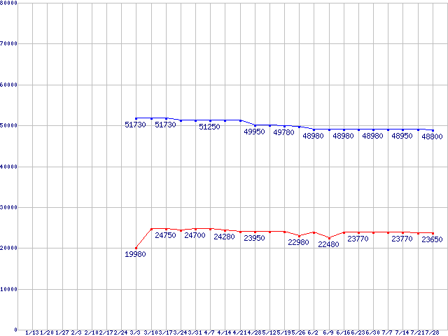 | SSD 510 (SSD,6Gbps,2.5インチ,リード500〜450MB/s・ライト315〜210MB/s)の最安値推移 |