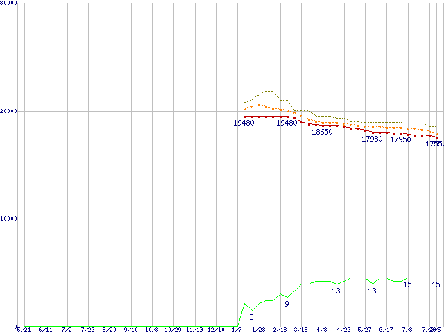 Core i5-2500K (3.30GHz,TDP 95W)の価格推移↑前グラフ↓次グラフ(2010年5月21日〜2011年8月5日)※このグラフは過去のデータも税率5%相当に調整した税込み相当額のグラフです。●関連グラフCPU主要製品の最安値推移CPU主要製品(最安値1万円〜2万円未満)の最安値推移Intel系CPUの最安値推移LGA1155 (Smart Cache 6MB,Quad Core,GPU内蔵)の最安値推移Core i5(LGA1155)の最安値推移●凡例最安値(点線部は販売店未確認または未調査)平均値最高値ショップ数