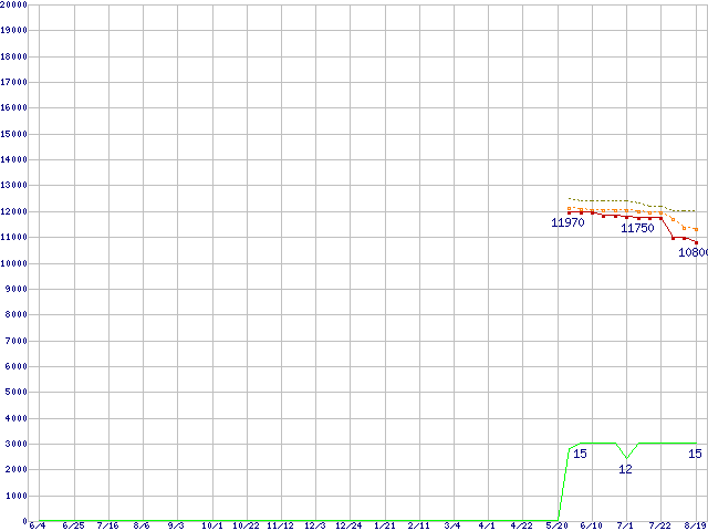 Core i3-2105 (3.10GHz,TDP 65W)の価格推移↑前グラフ↓次グラフ(2010年6月4日〜2011年8月19日)※このグラフは過去のデータも税率5%相当に調整した税込み相当額のグラフです。●関連グラフCPU主要製品の最安値推移CPU主要製品(最安値1万円〜2万円未満)の最安値推移Intel系CPUの最安値推移LGA1155 (Smart Cache 3MB,Dual Core,GPU内蔵,Hyper-Threading)の最安値推移●凡例最安値(点線部は販売店未確認または未調査)平均値最高値ショップ数