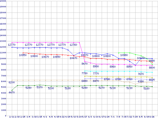 CPU主要製品(最安値1万円未満)の最安値推移↑前グラフ↓次グラフ(2011年2月11日〜2011年8月26日)※このグラフは過去のデータも税率5%相当に調整した税込み相当額のグラフです。凡例Phenom II X4 955 (3.2GHz,L2 512KB×4,L3 6MB,TDP 95W)Core i3-2100 (3.1GHz,TDP 65W)A6-3650 (2.6GHz,TDP 100W)Athlon II X4 615e (2.5GHz,L2 512KB×4,TDP 45W)Pentium G850 (2.9GHz,TDP 65W)Pentium G840 (2.8GHz,TDP 65W)Pentium G620T (2.2GHz,TDP 35W)Athlon II X2 265 (3.3GHz,L2 1MB×2,TDP 65W)Athlon II X2 255 (3.1GHz,L2 1MB×2,TDP 65W)※製品名をクリックすると個別のグラフを表示します※点線部は販売店が確認できなかった、または調査データがないことを示します
