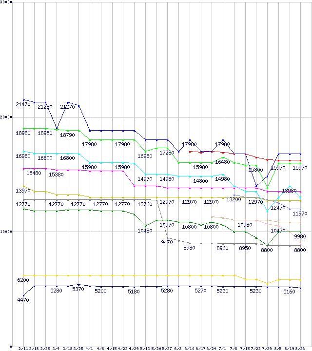 AMD系CPUの最安値推移↑前グラフ↓次グラフ(2011年2月11日〜2011年8月26日)※このグラフは過去のデータも税率5%相当に調整した税込み相当額のグラフです。凡例Phenom II X6 1100T Black Edition (3.3GHz,L2 512KB×6,L3 6MB,TDP 125W)Phenom II X4 980 Black Edition (3.7GHz,L2 512KB×4,L3 6MB,TDP 125W)Phenom II X6 1090T Black Edition (3.2GHz,L2 512KB×6,L3 6MB,TDP 125W)Phenom II X4 970 Black Edition (3.5GHz,L2 512KB×4,L3 6MB,TDP 125W)Phenom II X6 1065T (2.9GHz,L2 512KB×6,L3 6MB,TDP 95W)Phenom II X4 910e (2.6GHz,L2 512KB×4,L3 6MB,TDP 65W)A8-3850 (2.9GHz,TDP 100W)Phenom II X4 960T Black Edition (3.0GHz,L2 512KB×4,L3 6MB,TDP 95W)Phenom II X4 955 (3.2GHz,L2 512KB×4,L3 6MB,TDP 95W)A6-3650 (2.6GHz,TDP 100W)Athlon II X4 615e (2.5GHz,L2 512KB×4,TDP 45W)Athlon II X2 265 (3.3GHz,L2 1MB×2,TDP 65W)Athlon II X2 255 (3.1GHz,L2 1MB×2,TDP 65W)※製品名をクリックすると個別のグラフを表示します※点線部は販売店が確認できなかった、または調査データがないことを示します