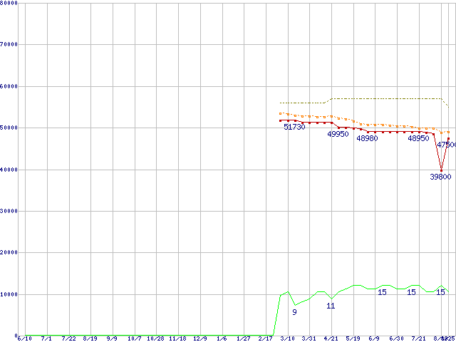 SSDSC2MH250A2K5 (250GB,MLC)の価格推移↑前グラフ↓次グラフ(2010年6月10日〜2011年8月25日)※このグラフは過去のデータも税率5%相当に調整した税込み相当額のグラフです。●関連グラフHDD/SSD主要製品の最安値推移HDD/SSD主要製品(最安値2万円以上)の最安値推移HDD 250〜300GB未満の最安値推移SSD 510 (SSD,6Gbps,2.5インチ,リード500〜450MB/s・ライト315〜210MB/s)の最安値推移●凡例最安値(点線部は販売店未確認または未調査)平均値最高値ショップ数