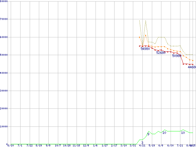 VTX3-25SAT3-240G (240GB,MLC)の価格推移↑前グラフ↓次グラフ(2010年6月10日〜2011年8月25日)※このグラフは過去のデータも税率5%相当に調整した税込み相当額のグラフです。●関連グラフHDD/SSD主要製品の最安値推移HDD/SSD主要製品(最安値2万円以上)の最安値推移HDD 200〜250GB未満の最安値推移Vertex 3 (SSD,6Gbps,2.5インチ,リード550〜530MB/s・ライト520〜450MB/s)の最安値推移●凡例最安値(点線部は販売店未確認または未調査)平均値最高値ショップ数