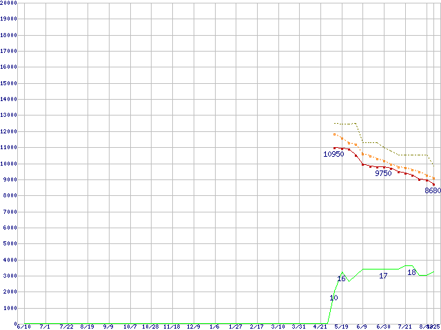 CT064M4SSD2 (64GB,MLC)の価格推移↑前グラフ↓次グラフ(2010年6月10日〜2011年8月25日)※このグラフは過去のデータも税率5%相当に調整した税込み相当額のグラフです。●関連グラフHDD/SSD主要製品の最安値推移HDD/SSD主要製品(最安値1万円未満)の最安値推移HDD/SSD 60GB〜80GB未満の最安値推移m4 (SSD,6Gbps,2.5インチ,リード415MB/s・ライト260〜95MB/s)の最安値推移●凡例最安値(点線部は販売店未確認または未調査)平均値最高値ショップ数