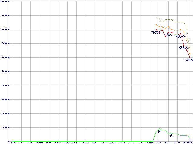 その他6Gbps対応SSD (512GB,MLC)の価格推移↑前グラフ↓次グラフ(2010年6月10日〜2011年8月25日)※このグラフは過去のデータも税率5%相当に調整した税込み相当額のグラフです。●関連グラフHDD/SSD主要製品の最安値推移HDD/SSD主要製品(最安値2万円以上)の最安値推移HDD 500〜600GB未満の最安値推移2.5インチSSD (SSD,6Gbps,2.5インチ)の最安値推移●凡例最安値(点線部は販売店未確認または未調査)平均値最高値ショップ数