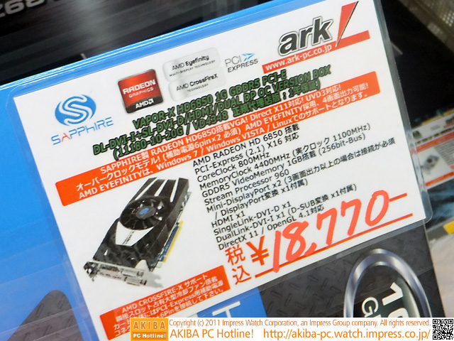 ![]() | AKIBA PC Hotline! 今週見つけた新製品:ビデオカード [拡大画像]SAPPHIRE VAPOR-X HD6850 1G GDDR5 PCI-E DL-DVI+SL-DVI-D/HDMI/DUAL MINI DP OC VERSION(11180-10-20G) |