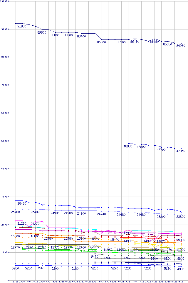 CPU主要製品の最安値推移↑前グラフ(2011年2月18日〜2011年9月2日)※このグラフは過去のデータも税率5%相当に調整した税込み相当額のグラフです。凡例Core i7-990X Extreme Edition (3.46GHz)Core i7-980 (3.33GHz)Core i7-2600K (3.40GHz)Core i7-2600 (3.40GHz)Core i5-2500K (3.30GHz,TDP 95W)Core i5-2405S (2.50GHz,TDP 65W)Phenom II X6 1100T Black Edition (3.3GHz,L2 512KB×6,L3 6MB,TDP 125W)Core i5-2500 (3.30GHz,TDP 95W)Phenom II X4 980 Black Edition (3.7GHz,L2 512KB×4,L3 6MB,TDP 125W)Phenom II X6 1090T Black Edition (3.2GHz,L2 512KB×6,L3 6MB,TDP 125W)Core i5-2400 (3.10GHz,TDP 95W)Core i5-2310 (2.90GHz,TDP 95W)Phenom II X4 970 Black Edition (3.5GHz,L2 512KB×4,L3 6MB,TDP 125W)Phenom II X6 1065T (2.9GHz,L2 512KB×6,L3 6MB,TDP 95W)Phenom II X4 910e (2.6GHz,L2 512KB×4,L3 6MB,TDP 65W)A8-3850 (2.9GHz,TDP 100W)Core i3-2120 (3.3GHz,TDP 65W)Phenom II X4 960T Black Edition (3.0GHz,L2 512KB×4,L3 6MB,TDP 95W)Core i3-2105 (3.10GHz,TDP 65W)Core i3-2100T (2.50GHz,TDP 35W)Phenom II X4 955 (3.2GHz,L2 512KB×4,L3 6MB,TDP 95W)Core i3-2100 (3.1GHz,TDP 65W)A6-3650 (2.6GHz,TDP 100W)Athlon II X4 615e (2.5GHz,L2 512KB×4,TDP 45W)Pentium G850 (2.9GHz,TDP 65W)Pentium G840 (2.8GHz,TDP 65W)Pentium G620T (2.2GHz,TDP 35W)Athlon II X2 265 (3.3GHz,L2 1MB×2,TDP 65W)Athlon II X2 255 (3.1GHz,L2 1MB×2,TDP 65W)※製品名をクリックすると個別のグラフを表示します※点線部は販売店が確認できなかった、または調査データがないことを示します