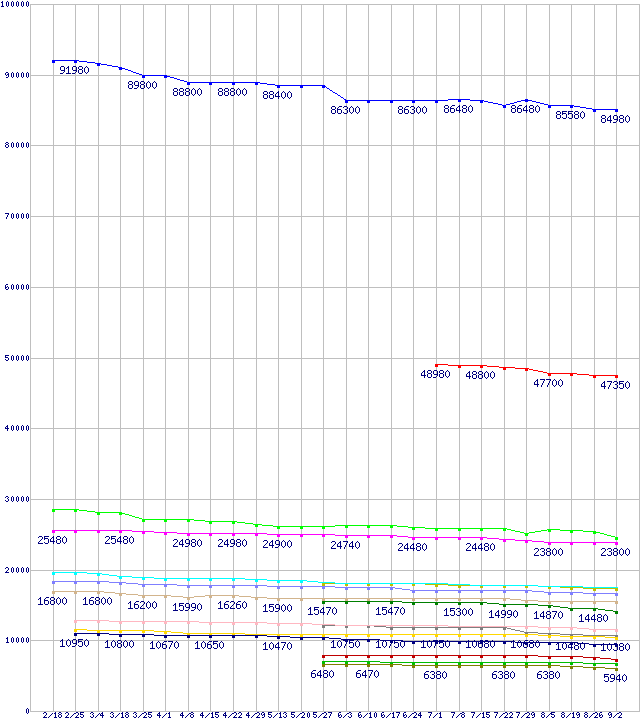 Intel系CPUの最安値推移↑前グラフ↓次グラフ(2011年2月18日〜2011年9月2日)※このグラフは過去のデータも税率5%相当に調整した税込み相当額のグラフです。凡例Core i7-990X Extreme Edition (3.46GHz)Core i7-980 (3.33GHz)Core i7-2600K (3.40GHz)Core i7-2600 (3.40GHz)Core i5-2500K (3.30GHz,TDP 95W)Core i5-2405S (2.50GHz,TDP 65W)Core i5-2500 (3.30GHz,TDP 95W)Core i5-2400 (3.10GHz,TDP 95W)Core i5-2310 (2.90GHz,TDP 95W)Core i3-2120 (3.3GHz,TDP 65W)Core i3-2105 (3.10GHz,TDP 65W)Core i3-2100T (2.50GHz,TDP 35W)Core i3-2100 (3.1GHz,TDP 65W)Pentium G850 (2.9GHz,TDP 65W)Pentium G840 (2.8GHz,TDP 65W)Pentium G620T (2.2GHz,TDP 35W)※製品名をクリックすると個別のグラフを表示します※点線部は販売店が確認できなかった、または調査データがないことを示します