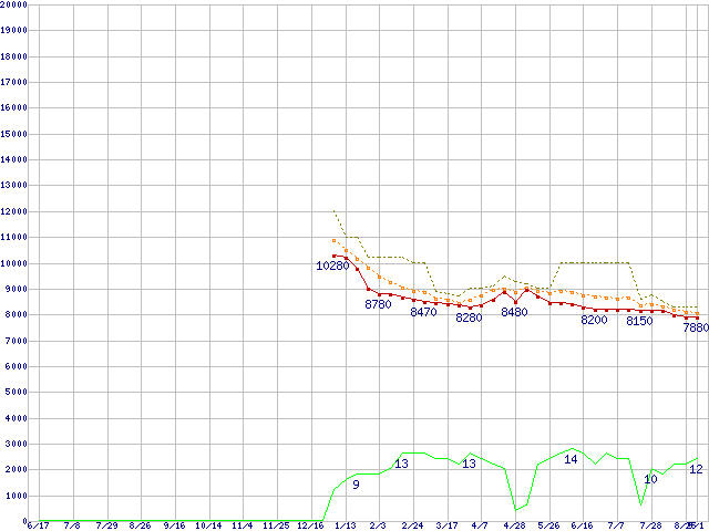 0S03191(純正パッケージ品) (2TB,64MB)の価格推移↑前グラフ↓次グラフ(2010年6月17日〜2011年9月1日)※このグラフは過去のデータも税率5%相当に調整した税込み相当額のグラフです。●関連グラフHDD/SSD主要製品の最安値推移HDD/SSD主要製品(最安値1万円未満)の最安値推移HDD 2TB〜2.5TB未満の最安値推移DESKSTAR (6Gb/s)の最安値推移●凡例最安値(点線部は販売店未確認または未調査)平均値最高値ショップ数