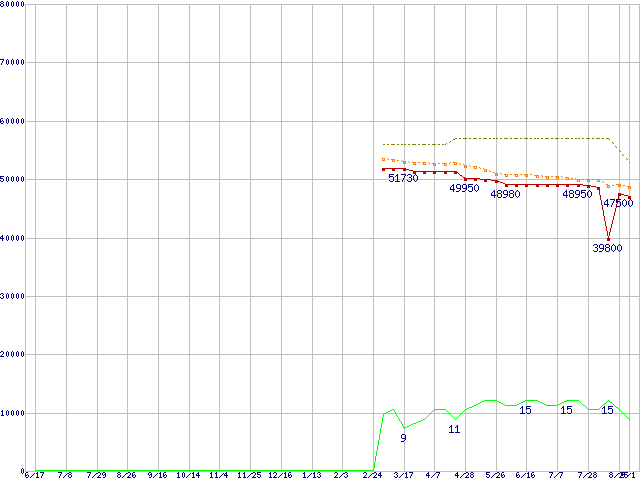 SSDSC2MH250A2K5 (250GB,MLC)の価格推移↑前グラフ↓次グラフ(2010年6月17日〜2011年9月1日)※このグラフは過去のデータも税率5%相当に調整した税込み相当額のグラフです。●関連グラフHDD/SSD主要製品の最安値推移HDD/SSD主要製品(最安値2万円以上)の最安値推移HDD 250〜300GB未満の最安値推移SSD 510 (SSD,6Gbps,2.5インチ,リード500〜450MB/s・ライト315〜210MB/s)の最安値推移●凡例最安値(点線部は販売店未確認または未調査)平均値最高値ショップ数
