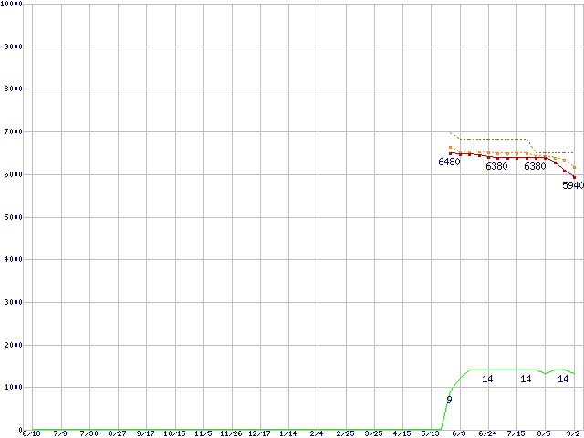 Pentium G620T (2.2GHz,TDP 35W)の価格推移↑前グラフ↓次グラフ(2010年6月18日〜2011年9月2日)※このグラフは過去のデータも税率5%相当に調整した税込み相当額のグラフです。●関連グラフCPU主要製品の最安値推移CPU主要製品(最安値1万円未満)の最安値推移Intel系CPUの最安値推移LGA1155 (Smart Cache 3MB,Dual Core,GPU内蔵)の最安値推移●凡例最安値(点線部は販売店未確認または未調査)平均値最高値ショップ数