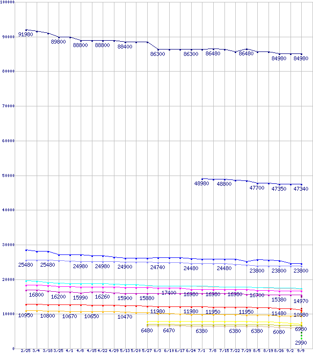Intel系CPUの最安値推移↑前グラフ↓次グラフ(2011年2月25日〜2011年9月9日)※このグラフは過去のデータも税率5%相当に調整した税込み相当額のグラフです。凡例Core i7-990X Extreme Edition (3.46GHz)Core i7-980 (3.33GHz)Core i7-2600K (3.40GHz)Core i7-2600 (3.40GHz)Core i5-2500K (3.30GHz,TDP 95W)Core i5-2405S (2.50GHz,TDP 65W)Core i5-2500 (3.30GHz,TDP 95W)Core i5-2400 (3.10GHz,TDP 95W)Core i5-2320 (3.00GHz,TDP 95W)Core i3-2130 (3.4GHz,TDP 65W)Core i3-2125 (3.30GHz,TDP 65W)Core i3-2120 (3.3GHz,TDP 65W)Core i3-2120T (2.60GHz,TDP 35W)Core i3-2100 (3.1GHz,TDP 65W)Pentium G860 (3.0GHz,TDP 65W)Pentium G850 (2.9GHz,TDP 65W)Pentium G840 (2.8GHz,TDP 65W)Pentium G630 (2.7GHz,TDP 65W)Pentium G620T (2.2GHz,TDP 35W)Celeron G540 (2.5GHz,2MB,TDP 65W)Celeron G530 (2.4GHz,2MB,TDP 65W)Celeron G440 (1.6GHz,1MB,シングルコア,TDP 35W)※製品名をクリックすると個別のグラフを表示します※点線部は販売店が確認できなかった、または調査データがないことを示します