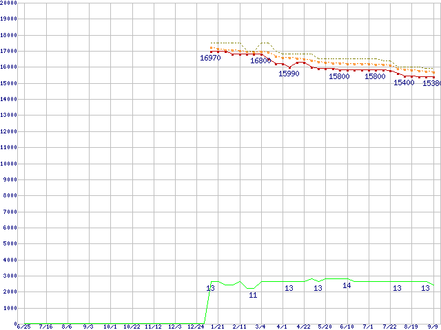 Core i5-2400 (3.10GHz,TDP 95W)の価格推移↑前グラフ↓次グラフ(2010年6月25日〜2011年9月9日)※このグラフは過去のデータも税率5%相当に調整した税込み相当額のグラフです。●関連グラフCPU主要製品の最安値推移CPU主要製品(最安値1万円〜2万円未満)の最安値推移Intel系CPUの最安値推移LGA1155 (Smart Cache 6MB,Quad Core,GPU内蔵)の最安値推移●凡例最安値(点線部は販売店未確認または未調査)平均値最高値ショップ数