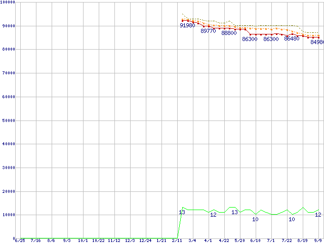 Core i7-990X Extreme Edition (3.46GHz)の価格推移↑前グラフ↓次グラフ(2010年6月25日〜2011年9月9日)※このグラフは過去のデータも税率5%相当に調整した税込み相当額のグラフです。●関連グラフCPU主要製品の最安値推移CPU主要製品(最安値6万円以上)の最安値推移Intel系CPUの最安値推移LGA1366 (QPI 6.4GT/s,L3キャッシュ12MB,6Core,Hyper-Threading,TDP 130W)の最安値推移●凡例最安値(点線部は販売店未確認または未調査)平均値最高値ショップ数
