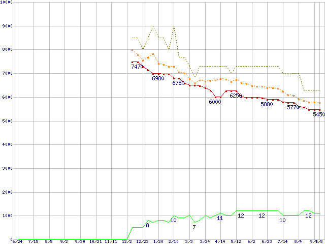 0S03085 (750GB,8MB)の価格推移↑前グラフ↓次グラフ(2010年6月24日〜2011年9月8日)※このグラフは過去のデータも税率5%相当に調整した税込み相当額のグラフです。●関連グラフHDD/SSD主要製品の最安値推移HDD/SSD主要製品(最安値1万円未満)の最安値推移HDD 750GB〜1TB未満の最安値推移TRAVELSTAR (5400rpm,3Gb/s,2.5インチ)の最安値推移●凡例最安値(点線部は販売店未確認または未調査)平均値最高値ショップ数