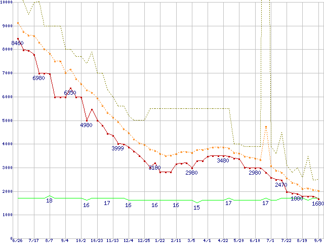 PC3-10600 2GB×2枚組みセットの価格推移↑前グラフ↓次グラフ(2010年6月26日〜2011年9月9日)※このグラフは過去のデータも税率5%相当に調整した税込み相当額のグラフです。●関連グラフメモリ主要製品の最安値推移4GBモジュール/2GBモジュール×2枚の最安値推移メモリ主要製品(最安値5千円未満)の最安値推移PC3-10600(DDR3-1333) DDR3 SDRAM DIMMの最安値推移●凡例最安値(点線部は販売店未確認または未調査)平均値最高値ショップ数