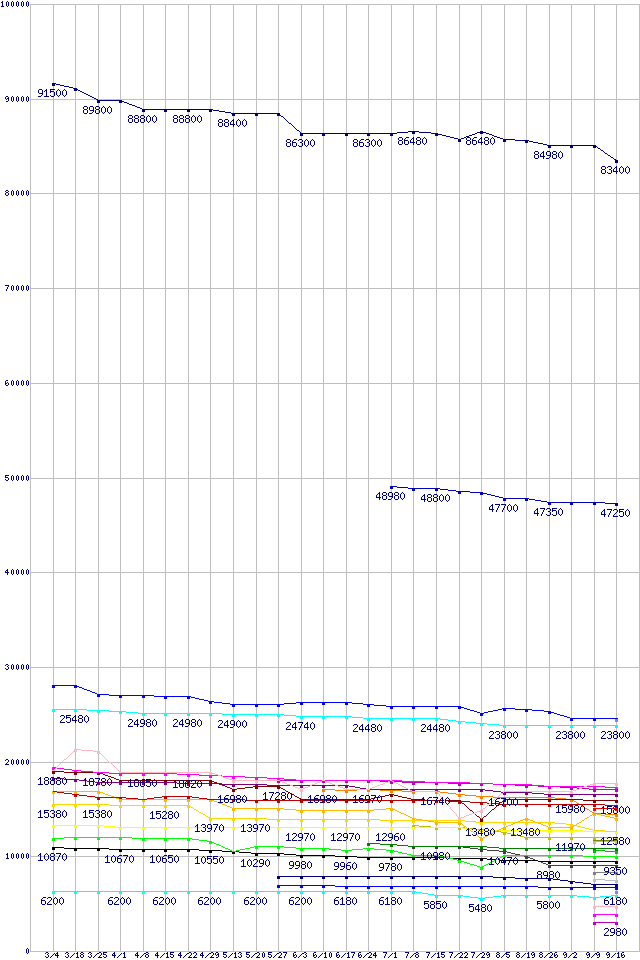 CPU主要製品の最安値推移↑前グラフ↓次グラフ(2011年3月4日〜2011年9月16日)※このグラフは過去のデータも税率5%相当に調整した税込み相当額のグラフです。凡例Core i7-990X Extreme Edition (3.46GHz)Core i7-980 (3.33GHz)Core i7-2600K (3.40GHz)Core i7-2600S (2.80GHz)Core i7-2600 (3.40GHz)Phenom II X6 1100T Black Edition (3.3GHz,L2 512KB×6,L3 6MB,TDP 125W)Core i5-2500K (3.30GHz,TDP 95W)Core i5-2405S (2.50GHz,TDP 65W)Core i5-2500 (3.30GHz,TDP 95W)Phenom II X6 1090T Black Edition (3.2GHz,L2 512KB×6,L3 6MB,TDP 125W)Core i5-2400 (3.10GHz,TDP 95W)Core i5-2320 (3.00GHz,TDP 95W)Phenom II X4 980 Black Edition (3.7GHz,L2 512KB×4,L3 6MB,TDP 125W)Phenom II X6 1065T (2.9GHz,L2 512KB×6,L3 6MB,TDP 95W)Phenom II X4 970 Black Edition (3.5GHz,L2 512KB×4,L3 6MB,TDP 125W)Phenom II X4 910e (2.6GHz,L2 512KB×4,L3 6MB,TDP 65W)A8-3850 (2.9GHz,TDP 100W)Core i3-2130 (3.4GHz,TDP 65W)Core i3-2125 (3.30GHz,TDP 65W)Phenom II X4 960T Black Edition (3.0GHz,L2 512KB×4,L3 6MB,TDP 95W)Core i3-2120T (2.60GHz,TDP 35W)Phenom II X4 955 (3.2GHz,L2 512KB×4,L3 6MB,TDP 95W)Core i3-2100 (3.1GHz,TDP 65W)A6-3650 (2.6GHz,TDP 100W)A6-3500 (2.1GHz,TDP 65W)Pentium G860 (3.0GHz,TDP 65W)Pentium G850 (2.9GHz,TDP 65W)Athlon II X4 631 (2.6GHz,TDP 100W)Pentium G840 (2.8GHz,TDP 65W)Pentium G630T (2.3GHz,TDP 35W)Athlon II X2 265 (3.3GHz,L2 1MB×2,TDP 65W)Celeron G540 (2.5GHz,2MB,TDP 65W)Celeron G530 (2.4GHz,2MB,TDP 65W)Celeron G440 (1.6GHz,1MB,シングルコア,TDP 35W)※製品名をクリックすると個別のグラフを表示します※点線部は販売店が確認できなかった、または調査データがないことを示します