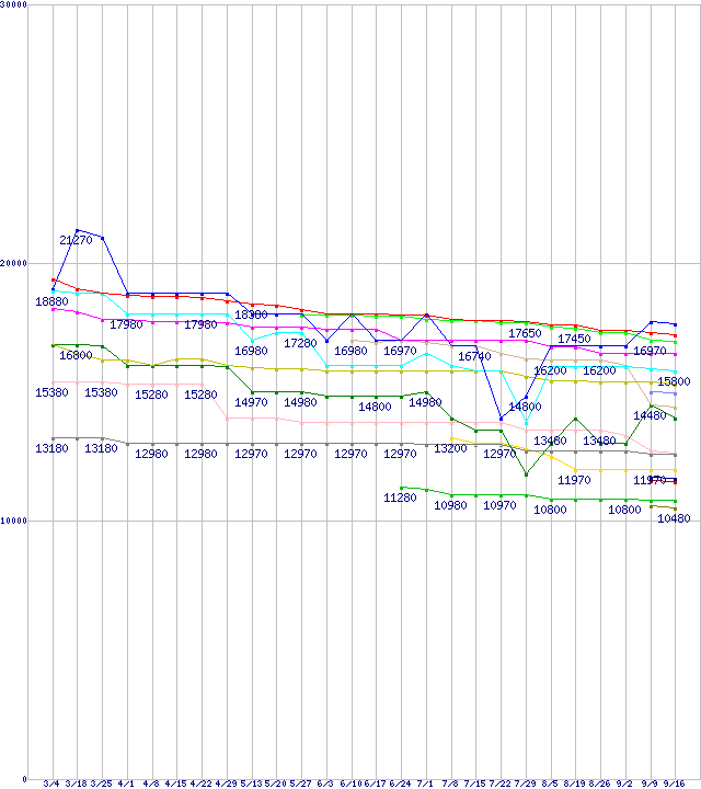 CPU主要製品(最安値1万円〜2万円未満)の最安値推移↑前グラフ↓次グラフ(2011年3月4日〜2011年9月16日)※このグラフは過去のデータも税率5%相当に調整した税込み相当額のグラフです。凡例Phenom II X6 1100T Black Edition (3.3GHz,L2 512KB×6,L3 6MB,TDP 125W)Core i5-2500K (3.30GHz,TDP 95W)Core i5-2405S (2.50GHz,TDP 65W)Core i5-2500 (3.30GHz,TDP 95W)Phenom II X6 1090T Black Edition (3.2GHz,L2 512KB×6,L3 6MB,TDP 125W)Core i5-2400 (3.10GHz,TDP 95W)Core i5-2320 (3.00GHz,TDP 95W)Phenom II X4 980 Black Edition (3.7GHz,L2 512KB×4,L3 6MB,TDP 125W)Phenom II X6 1065T (2.9GHz,L2 512KB×6,L3 6MB,TDP 95W)Phenom II X4 970 Black Edition (3.5GHz,L2 512KB×4,L3 6MB,TDP 125W)Phenom II X4 910e (2.6GHz,L2 512KB×4,L3 6MB,TDP 65W)A8-3850 (2.9GHz,TDP 100W)Core i3-2130 (3.4GHz,TDP 65W)Core i3-2125 (3.30GHz,TDP 65W)Phenom II X4 960T Black Edition (3.0GHz,L2 512KB×4,L3 6MB,TDP 95W)Core i3-2120T (2.60GHz,TDP 35W)※製品名をクリックすると個別のグラフを表示します※点線部は販売店が確認できなかった、または調査データがないことを示します