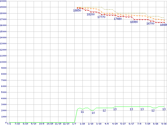 Core i5-2500 (3.30GHz,TDP 95W)の価格推移↑前グラフ↓次グラフ(2010年7月2日〜2011年9月16日)※このグラフは過去のデータも税率5%相当に調整した税込み相当額のグラフです。●関連グラフCPU主要製品の最安値推移CPU主要製品(最安値1万円〜2万円未満)の最安値推移Intel系CPUの最安値推移LGA1155 (Smart Cache 6MB,Quad Core,GPU内蔵)の最安値推移●凡例最安値(点線部は販売店未確認または未調査)平均値最高値ショップ数