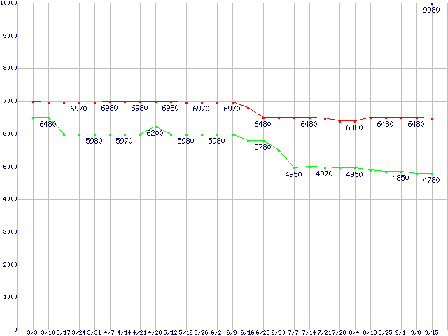 | WD Scorpio Blue (5200〜5400rpm,3Gb/s,2.5インチ)の最安値推移 |