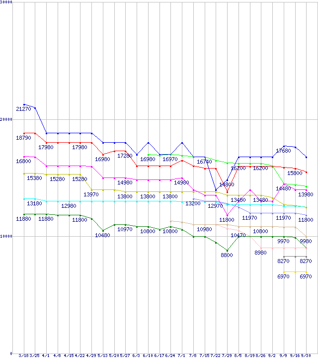 AMD系CPUの最安値推移↑前グラフ↓次グラフ(2011年3月18日〜2011年9月30日)※このグラフは過去のデータも税率5%相当に調整した税込み相当額のグラフです。凡例Phenom II X6 1100T Black Edition (3.3GHz,L2 512KB×6,L3 6MB,TDP 125W)Phenom II X6 1090T Black Edition (3.2GHz,L2 512KB×6,L3 6MB,TDP 125W)Phenom II X4 980 Black Edition (3.7GHz,L2 512KB×4,L3 6MB,TDP 125W)Phenom II X6 1065T (2.9GHz,L2 512KB×6,L3 6MB,TDP 95W)Phenom II X4 910e (2.6GHz,L2 512KB×4,L3 6MB,TDP 65W)Phenom II X4 970 Black Edition (3.5GHz,L2 512KB×4,L3 6MB,TDP 125W)A8-3850 (2.9GHz,TDP 100W)Phenom II X4 960T Black Edition (3.0GHz,L2 512KB×4,L3 6MB,TDP 95W)Phenom II X4 955 (3.2GHz,L2 512KB×4,L3 6MB,TDP 95W)A6-3650 (2.6GHz,TDP 100W)A6-3500 (2.1GHz,TDP 65W)Athlon II X4 631 (2.6GHz,TDP 100W)※製品名をクリックすると個別のグラフを表示します※点線部は販売店が確認できなかった、または調査データがないことを示します