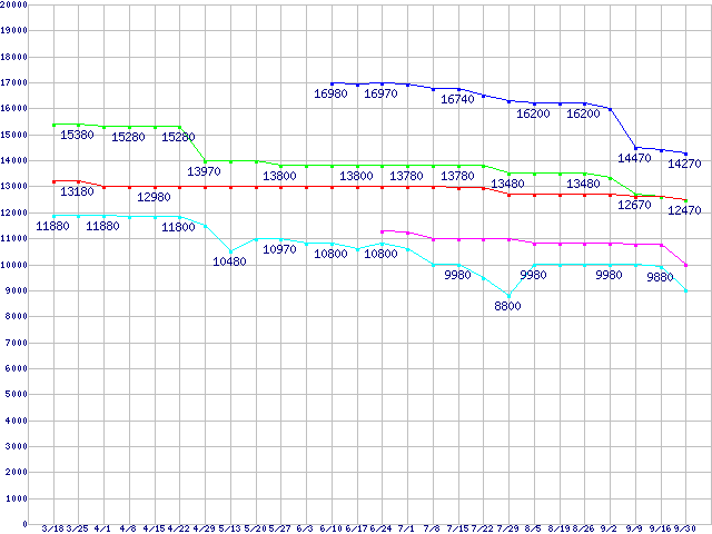 Socket AM3 (HyperTransport 3.0,Quad Core)の最安値推移↑前グラフ↓次グラフ(2011年3月18日〜2011年9月30日)※このグラフは過去のデータも税率5%相当に調整した税込み相当額のグラフです。凡例Phenom II X4 980 Black Edition (3.7GHz,L2 512KB×4,L3 6MB,TDP 125W)Phenom II X4 910e (2.6GHz,L2 512KB×4,L3 6MB,TDP 65W)Phenom II X4 970 Black Edition (3.5GHz,L2 512KB×4,L3 6MB,TDP 125W)Phenom II X4 960T Black Edition (3.0GHz,L2 512KB×4,L3 6MB,TDP 95W)Phenom II X4 955 (3.2GHz,L2 512KB×4,L3 6MB,TDP 95W)※製品名をクリックすると個別のグラフを表示します※点線部は販売店が確認できなかった、または調査データがないことを示します