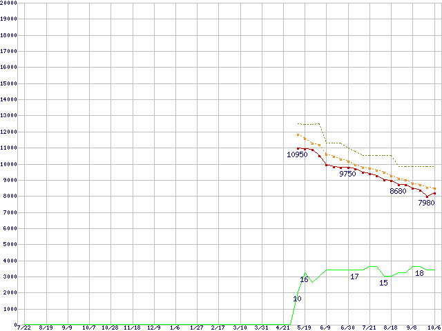 CT064M4SSD2 (64GB,MLC)の価格推移↑前グラフ↓次グラフ(2010年7月22日〜2011年10月6日)※このグラフは過去のデータも税率5%相当に調整した税込み相当額のグラフです。●関連グラフHDD/SSD主要製品の最安値推移HDD/SSD主要製品(最安値1万円未満)の最安値推移HDD/SSD 60GB〜80GB未満の最安値推移m4 (SSD,6Gbps,2.5インチ,リード415MB/s・ライト260〜95MB/s)の最安値推移●凡例最安値(点線部は販売店未確認または未調査)平均値最高値ショップ数