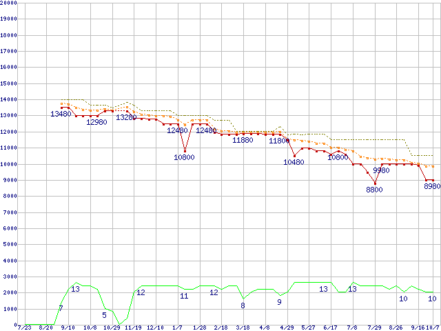 Phenom II X4 955 (3.2GHz,L2 512KB×4,L3 6MB,TDP 95W)の価格推移↑前グラフ↓次グラフ(2010年7月23日〜2011年10月7日)※このグラフは過去のデータも税率5%相当に調整した税込み相当額のグラフです。●関連グラフCPU主要製品の最安値推移CPU主要製品(最安値1万円未満)の最安値推移AMD系CPUの最安値推移Socket AM3 (HyperTransport 3.0,Quad Core)の最安値推移●凡例最安値(点線部は販売店未確認または未調査)平均値最高値ショップ数