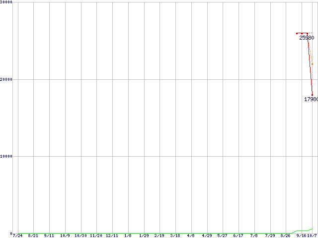 PC3-10600 8GBの価格推移↑前グラフ↓次グラフ(2010年7月24日〜2011年10月7日)※このグラフは過去のデータも税率5%相当に調整した税込み相当額のグラフです。●関連グラフメモリ主要製品の最安値推移メモリ主要製品(最安値1万円以上)の最安値推移PC3-10600(DDR3-1333) DDR3 SDRAM DIMMの最安値推移●凡例最安値(点線部は販売店未確認または未調査)平均値最高値ショップ数