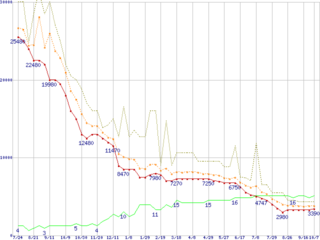 PC3-12800 4GB×2枚組みセットの価格推移↑前グラフ↓次グラフ(2010年7月24日〜2011年10月7日)※このグラフは過去のデータも税率5%相当に調整した税込み相当額のグラフです。●関連グラフメモリ主要製品の最安値推移メモリ主要製品(最安値5千円未満)の最安値推移PC3-12800(DDR3-1600) DDR3 SDRAM DIMMの最安値推移●凡例最安値(点線部は販売店未確認または未調査)平均値最高値ショップ数