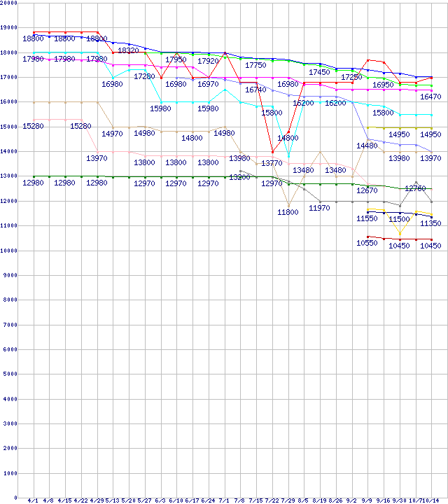 CPU主要製品(最安値1万円〜2万円未満)の最安値推移↑前グラフ↓次グラフ(2011年4月1日〜2011年10月14日)※このグラフは過去のデータも税率5%相当に調整した税込み相当額のグラフです。凡例Core i5-2500K (3.30GHz,TDP 95W)Phenom II X6 1100T Black Edition (3.3GHz,L2 512KB×6,L3 6MB,TDP 125W)Core i5-2405S (2.50GHz,TDP 65W)Core i5-2500 (3.30GHz,TDP 95W)Phenom II X6 1090T Black Edition (3.2GHz,L2 512KB×6,L3 6MB,TDP 125W)Core i5-2320 (3.00GHz,TDP 95W)Phenom II X4 980 Black Edition (3.7GHz,L2 512KB×4,L3 6MB,TDP 125W)Phenom II X6 1065T (2.9GHz,L2 512KB×6,L3 6MB,TDP 95W)Phenom II X4 910e (2.6GHz,L2 512KB×4,L3 6MB,TDP 65W)Phenom II X4 970 Black Edition (3.5GHz,L2 512KB×4,L3 6MB,TDP 125W)A8-3850 (2.9GHz,TDP 100W)Core i3-2130 (3.4GHz,TDP 65W)Core i3-2125 (3.30GHz,TDP 65W)Core i3-2120T (2.60GHz,TDP 35W)※製品名をクリックすると個別のグラフを表示します※点線部は販売店が確認できなかった、または調査データがないことを示します