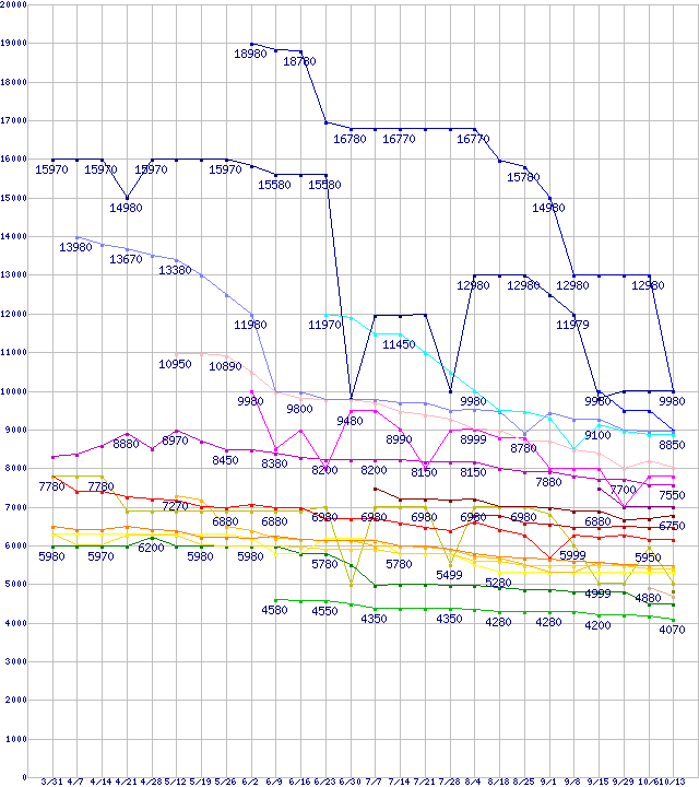 HDD/SSD主要製品(最安値1万円未満)の最安値推移↑前グラフ↓次グラフ(2011年3月31日〜2011年10月13日)※このグラフは過去のデータも税率5%相当に調整した税込み相当額のグラフです。凡例その他2.5インチSSD (128GB,MLC)その他6Gbps対応SSD (128GB,MLC)WD10JPVT (1TB,8MB)WD30EZRX (3TB,64MB)0S03229(純正パッケージ品) (3TB,32MB)CT064M4SSD2 (64GB,MLC)その他6Gbps対応SSD (64GB,MLC)0S03191(純正パッケージ品) (2TB,64MB)その他SandForce製コントローラ搭載SSD(6Gbps) (60GB,MLC)HN-M101MBB (1TB,8MB)WD25EZRX (2.5TB,64MB)0S03224(純正パッケージ品) (2TB,32MB)ST2000DL003 (2TB,64MB)WD20EARX (2TB,64MB)0S03085 (750GB,8MB)HD204UI (2TB,32MB)その他2.5インチSSD (64GB,MLC)0S03385(純正パッケージ品) (1TB,32MB)HDS721010DLE630 (1TB,32MB)WD7500BPVT (750GB,8MB)WD10EARX (1TB,64MB)※製品名をクリックすると個別のグラフを表示します※点線部は販売店が確認できなかった、または調査データがないことを示します