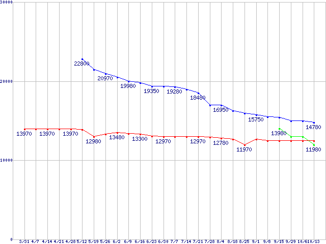 | HDD/SSD主要製品(最安値1万円〜1万5千円未満)の最安値推移 |