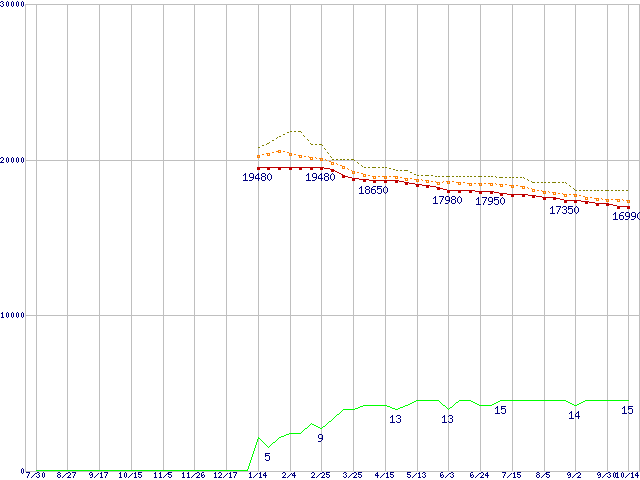 Core i5-2500K (3.30GHz,TDP 95W)の価格推移↑前グラフ↓次グラフ(2010年7月30日〜2011年10月14日)※このグラフは過去のデータも税率5%相当に調整した税込み相当額のグラフです。●関連グラフCPU主要製品の最安値推移CPU主要製品(最安値1万円〜2万円未満)の最安値推移Intel系CPUの最安値推移LGA1155 (Smart Cache 6MB,Quad Core,GPU内蔵)の最安値推移●凡例最安値(点線部は販売店未確認または未調査)平均値最高値ショップ数
