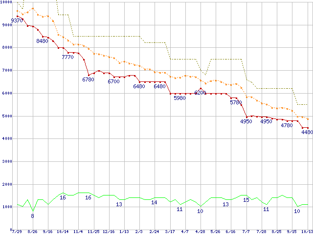 WD7500BPVT (750GB,8MB)の価格推移↑前グラフ↓次グラフ(2010年7月29日〜2011年10月13日)※このグラフは過去のデータも税率5%相当に調整した税込み相当額のグラフです。●関連グラフHDD/SSD主要製品の最安値推移HDD/SSD主要製品(最安値1万円未満)の最安値推移HDD 750GB〜1TB未満の最安値推移WD Scorpio Blue (5200〜5400rpm,3Gb/s,2.5インチ)の最安値推移●凡例最安値(点線部は販売店未確認または未調査)平均値最高値ショップ数