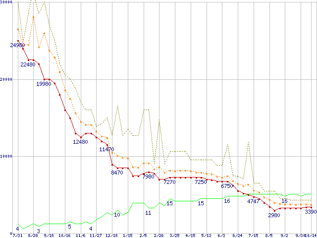 PC3-12800 4GB×2枚組みセットの価格推移↑前グラフ↓次グラフ(2010年7月31日〜2011年10月14日)※このグラフは過去のデータも税率5%相当に調整した税込み相当額のグラフです。●関連グラフメモリ主要製品の最安値推移メモリ主要製品(最安値5千円未満)の最安値推移PC3-12800(DDR3-1600) DDR3 SDRAM DIMMの最安値推移●凡例最安値(点線部は販売店未確認または未調査)平均値最高値ショップ数