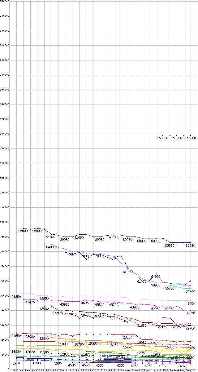 HDD/SSD主要製品の最安値推移↑前グラフ↓次グラフ(2011年4月7日〜2011年10月20日)※このグラフは過去のデータも税率5%相当に調整した税込み相当額のグラフです。凡例その他SandForce製コントローラ搭載SSD(6Gbps) (480GB,MLC)SSD 320 (600GB,MLC)その他6Gbps対応SSD (512GB,MLC)CT512M4SSD2 (512GB,MLC)SSD 710 (100GB,MLC)SSDSC2MH250A2K5 (250GB,MLC)SSD 320 (300GB,MLC)その他SandForce製コントローラ搭載SSD(6Gbps) (240GB,MLC)その他6Gbps対応SSD (256GB,MLC)CT256M4SSD2 (256GB,MLC)SSDSC2MH120A2K5 (120GB,MLC)SSD 320 (120GB,MLC)CT128M4SSD2 (128GB,MLC)その他6Gbps対応SSD (128GB,MLC)0S03088(純正パッケージ品) (3TB,64MB)その他SandForce製コントローラ搭載SSD(6Gbps) (120GB,MLC)その他2.5インチSSD (128GB,MLC)WD10JPVT (1TB,8MB)WD30EZRX (3TB,64MB)0S03229(純正パッケージ品) (3TB,32MB)0S03191(純正パッケージ品) (2TB,64MB)その他SandForce製コントローラ搭載SSD(6Gbps) (60GB,MLC)CT064M4SSD2 (64GB,MLC)その他6Gbps対応SSD (64GB,MLC)HN-M101MBB (1TB,8MB)WD25EZRX (2.5TB,64MB)0S03224(純正パッケージ品) (2TB,32MB)その他2.5インチSSD (64GB,MLC)WD20EARX (2TB,64MB)ST2000DL003 (2TB,64MB)HD204UI (2TB,32MB)0S03085 (750GB,8MB)0S03385(純正パッケージ品) (1TB,32MB)HDS721010DLE630 (1TB,32MB)WD7500BPVT (750GB,8MB)WD10EARX (1TB,64MB)※製品名をクリックすると個別のグラフを表示します※点線部は販売店が確認できなかった、または調査データがないことを示します