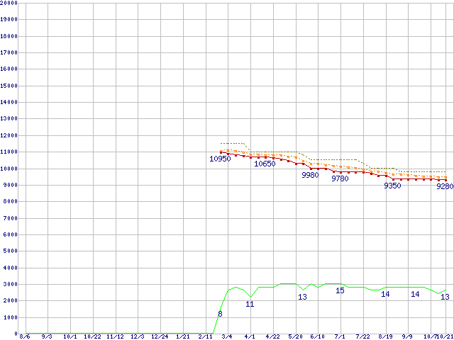 Core i3-2100 (3.1GHz,TDP 65W)の価格推移↑前グラフ↓次グラフ(2010年8月6日〜2011年10月21日)※このグラフは過去のデータも税率5%相当に調整した税込み相当額のグラフです。●関連グラフCPU主要製品の最安値推移CPU主要製品(最安値1万円未満)の最安値推移Intel系CPUの最安値推移LGA1155 (Smart Cache 3MB,Dual Core,GPU内蔵,Hyper-Threading)の最安値推移●凡例最安値(点線部は販売店未確認または未調査)平均値最高値ショップ数