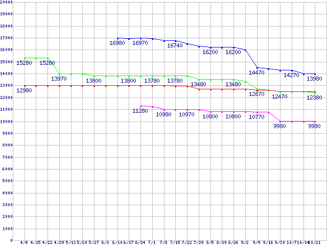 Socket AM3 (HyperTransport 3.0,Quad Core)の最安値推移↑前グラフ↓次グラフ(2011年4月8日〜2011年10月21日)※このグラフは過去のデータも税率5%相当に調整した税込み相当額のグラフです。凡例Phenom II X4 980 Black Edition (3.7GHz,L2 512KB×4,L3 6MB,TDP 125W)Phenom II X4 910e (2.6GHz,L2 512KB×4,L3 6MB,TDP 65W)Phenom II X4 970 Black Edition (3.5GHz,L2 512KB×4,L3 6MB,TDP 125W)Phenom II X4 960T Black Edition (3.0GHz,L2 512KB×4,L3 6MB,TDP 95W)※製品名をクリックすると個別のグラフを表示します※点線部は販売店が確認できなかった、または調査データがないことを示します