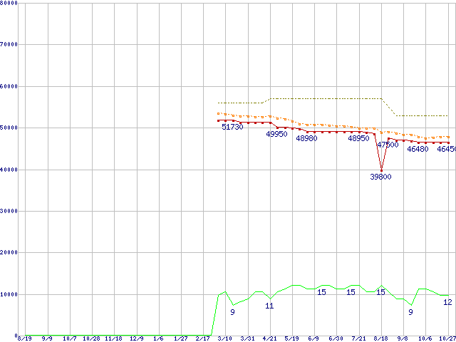 SSDSC2MH250A2K5 (250GB,MLC)の価格推移↑前グラフ↓次グラフ(2010年8月19日〜2011年10月27日)※このグラフは過去のデータも税率5%相当に調整した税込み相当額のグラフです。●関連グラフHDD/SSD主要製品の最安値推移HDD/SSD主要製品(最安値2万円以上)の最安値推移HDD 250〜300GB未満の最安値推移SSD 510 (SSD,6Gbps,2.5インチ,リード500〜450MB/s・ライト315〜210MB/s)の最安値推移●凡例最安値(点線部は販売店未確認または未調査)平均値最高値ショップ数