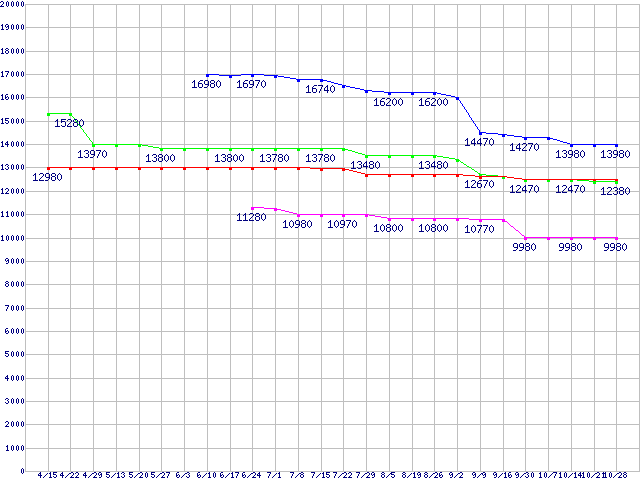 Socket AM3 (HyperTransport 3.0,Quad Core)の最安値推移↑前グラフ↓次グラフ(2011年4月15日〜2011年10月28日)※このグラフは過去のデータも税率5%相当に調整した税込み相当額のグラフです。凡例Phenom II X4 980 Black Edition (3.7GHz,L2 512KB×4,L3 6MB,TDP 125W)Phenom II X4 910e (2.6GHz,L2 512KB×4,L3 6MB,TDP 65W)Phenom II X4 970 Black Edition (3.5GHz,L2 512KB×4,L3 6MB,TDP 125W)Phenom II X4 960T Black Edition (3.0GHz,L2 512KB×4,L3 6MB,TDP 95W)※製品名をクリックすると個別のグラフを表示します※点線部は販売店が確認できなかった、または調査データがないことを示します